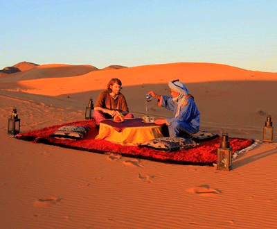 After breakfast, we visit the Gnaoua people to enjoy their traditional music and learn about their heritage. We continue to Merzouga’s seasonal lake, a peaceful spot home to diverse birdlife. Then we visit a nomadic family to discover Berber handicrafts and desert life. In the afternoon, we prepare for a camel trek into the golden dunes. Guided by a camel man, we ride toward the heart of the desert, stopping to watch a magical sunset. We spend the night in a luxury desert camp with comfortable tents and proper facilities. Enjoy dinner under a star-filled sky.