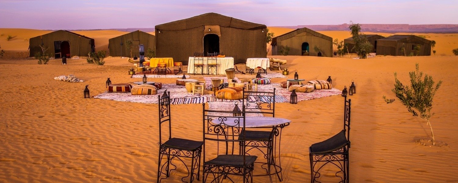 After breakfast, we visit the Gnaoua people to enjoy their traditional music and learn about their heritage. We continue to Merzouga’s seasonal lake, a peaceful spot home to diverse birdlife. Then we visit a nomadic family to discover Berber handicrafts and desert life. In the afternoon, we prepare for a camel trek into the golden dunes. Guided by a camel man, we ride toward the heart of the desert, stopping to watch a magical sunset. We spend the night in a luxury desert camp with comfortable tents and proper facilities. Enjoy dinner under a star-filled sky.